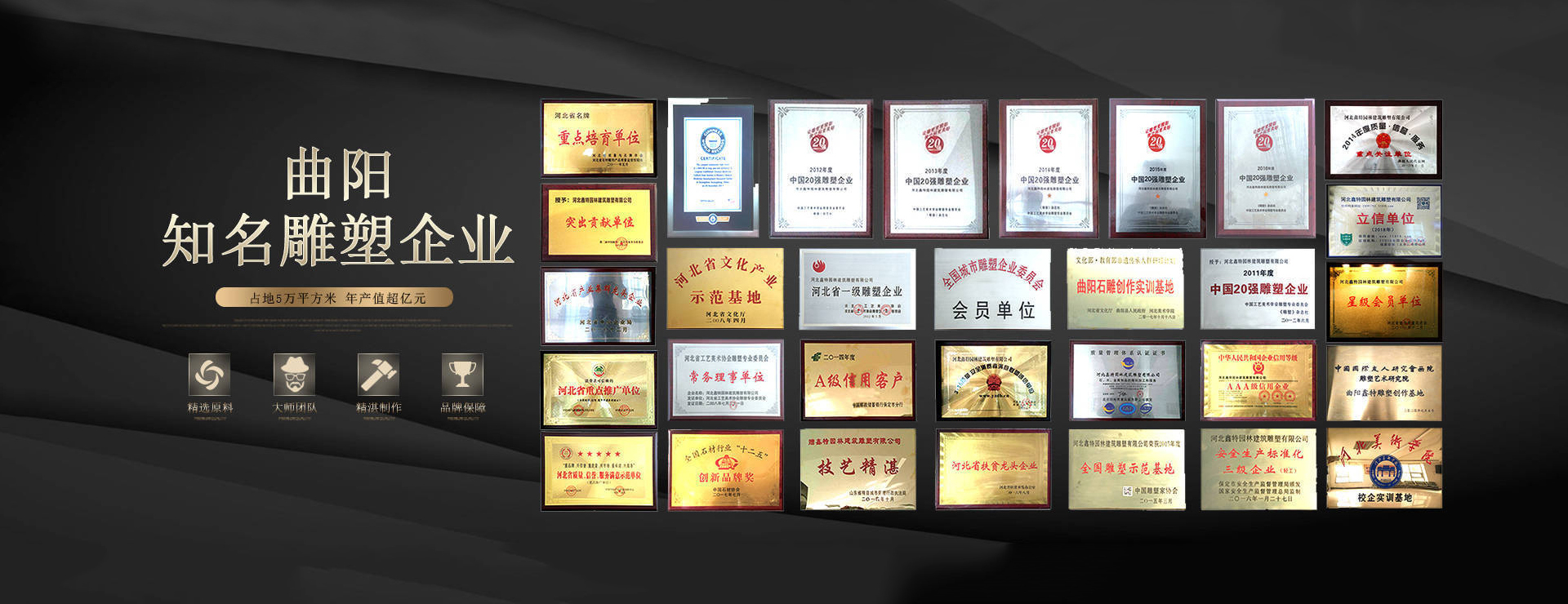 河北鑫特園林建筑雕塑有限公司成立于2002年,是中國雕刻之鄉(xiāng)——曲陽縣的一家實力雄厚的大型雕塑公司,公司占地面積50000+平方米,年產(chǎn)值超過億元,具有雕塑總承包一級資質(zhì)、古建筑三級資質(zhì)、市政公用工程施工總承包三級資質(zhì)。